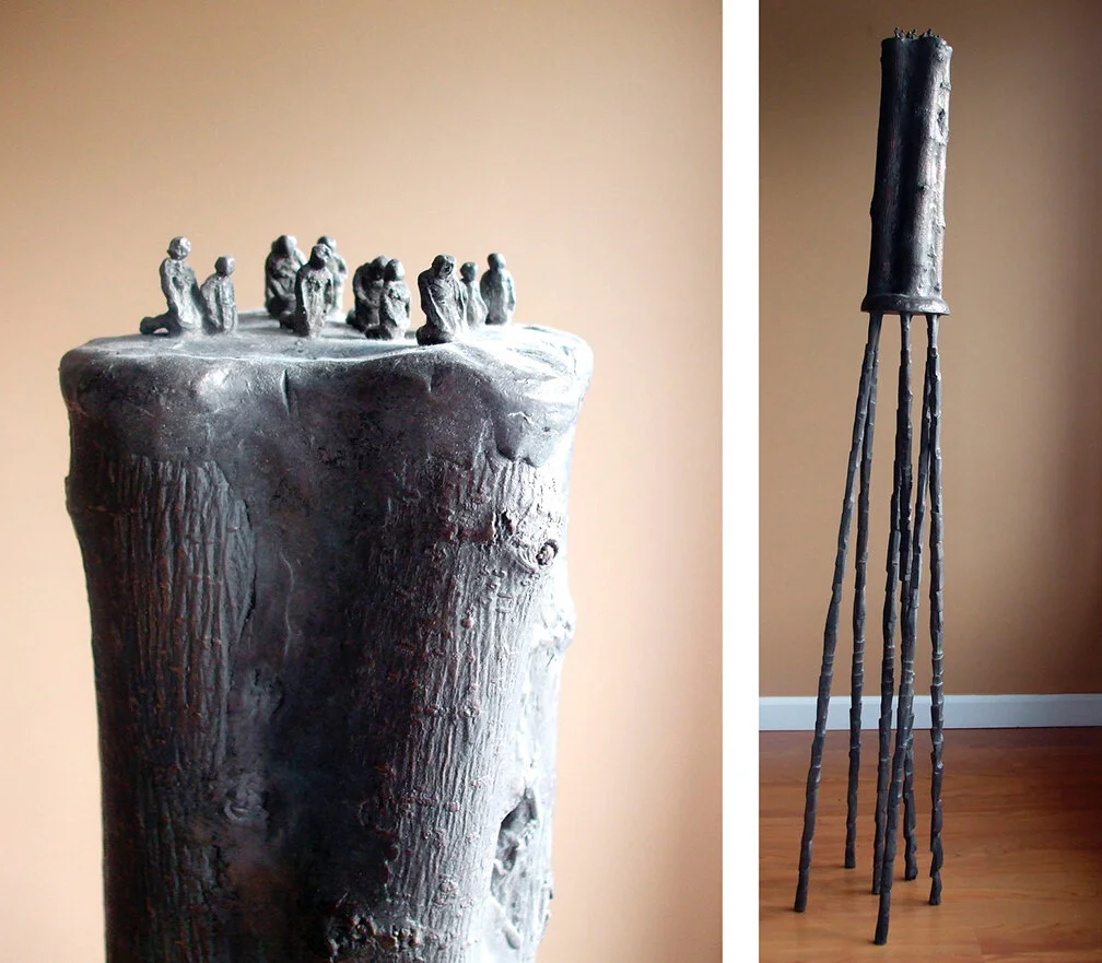 The slow descent of the people going down the stairwells of the World Trade Center on 9/11 is not a visual memory for me but an oral one. I listened to the first-hand accounts as workers told of walking down the flights of stairs as they watched the serious faces of the firemen ascend the same stairs beside them and of passing disabled workers who were stranded or carried by others. I remember the quiet sadness of learning who among us knew the lost, saved or missing. The figures in this sculpture represent all these people as well as those of us who grieve them and the world that we once knew.
